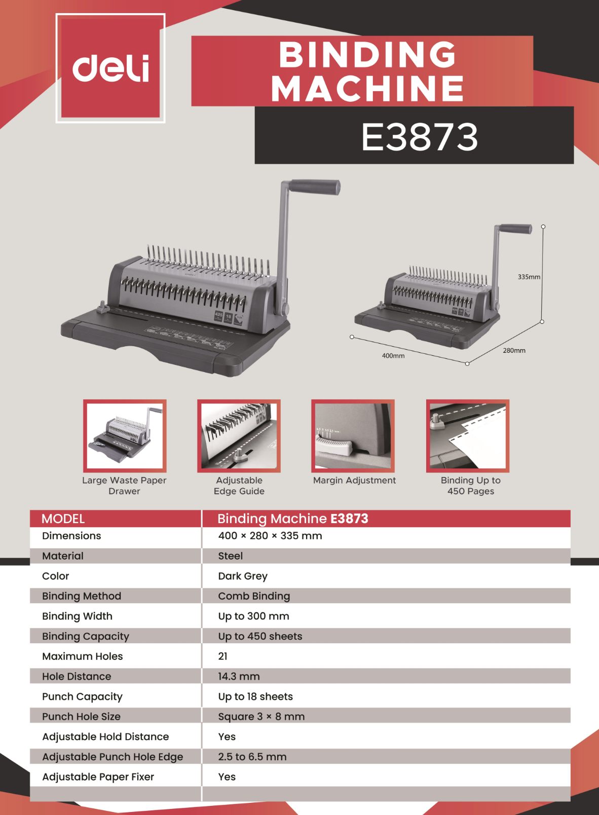 The Deli Binding Machine E3873 is a heavy-duty binding solution engineered for superior performance and precision.