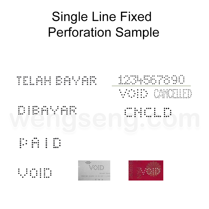- Perforation: Fixed text, symbols, Mark (Example fixed text: TELAH BAYAR, DIBAYAR, PAID, VOID, CANCELLATION)